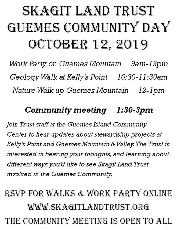 Join Trust staff at the Guemes Island Community Center from 1:30-3pm to hear updates about stewardship projects at Kelly’s Point and Guemes Mountain & Valley. The Trust is interested in hearing your thoughts, and learning about different ways you’d like to see Skagit Land Trust involved in the Guemes Community.