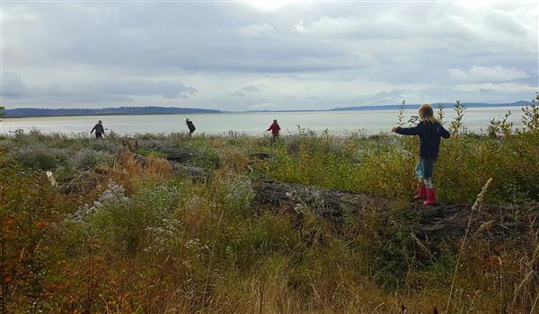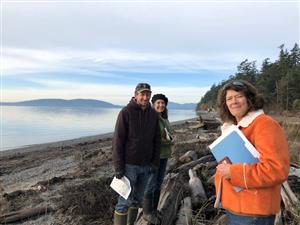 Pictured above: Trust staff on the beach. From left to right, Conservation Director Michael Kirshenbaum, Conservation Project Manager Jane Zillig, Executive Director Molly Doran. | “All of us are so grateful our community came out in full force to support this project,” said Executive Director Molly Doran. “This forest is a huge part of the Island’s character and we know how precious natural shoreline is. Padilla Bay holds the second largest bed of seagrass on the west coast – it is critical we keep it healthy. We plan to steward the property as wildlife habitat and provide ways for public access for walking and wildlife viewing. Low impact access can help engender conservation and education of Salish Sea habitats.” |