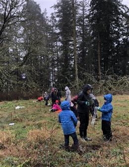 On a rainy winter day students from Fiddlehead Montessori on Fidalgo Island met Skagit Land Trust staff at the recently conserved Samish Flower Farm. The kids were looking forward to a day of stewardship activities. Staff began with an introduction to the history of the Samish Island property. Skagit Valley’s tulip farming began on the 34 acre site back in 1903, when Mary Stewart ordered her first bulbs and began experimenting with what grew best in the local soils. Now over a hundred years later, the bulbs had moved on the Skagit flatlands, and recovering wetlands remained. Students were led by Trust staff through hundreds of shrubs recently planted to help restore the habitat. The Trust’s Engagement AmeriCorps Member, Abby Weaver, talked with the students about how to identify a wetland and the unique ecosystems that wetlands create. Students called out different animals that would use the wetland, and concluded that wetlands are very important for wildlife!