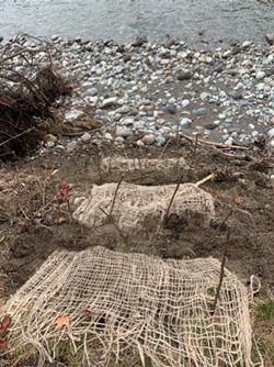 What is a Conservation Easement? Skagit Land Trust has both conservation easements and conservation areas. Conservation Areas are properties that Skagit Land Trust owns outright either by purchase or donation. Conservation Easements are properties that are still privately owned by a land owner. Land owners opt to create a binding agreement with Skagit Land Trust to ensure the land is protected into the future. This means that even if an easement is sold to another person later on, that person must abide by the rules of the easement. These rules vary for each property but they often limit development and disturbance to ecologically significant areas and allow Skagit Land Trust to help manage and restore the property. | |  Live Fascine and erosion control fabric installed along the Sauk River. The large pieces of concrete are from an old home foundation that was removed before Skagit Land Trust’s involvement. |