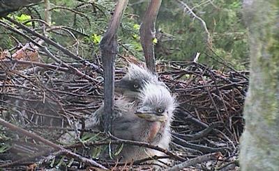 Great Blue Heron fledglings leave the nest at about two months of age. They are as big as their parents, so size will not help you identify them, but their coloring and feathers will. The fledglings are overall tinged brownish, and their feathers have a looser appearance than the adults. Their crowns are slate grey and lack the white crown stripe of the adults, but if you are really lucky you will see remnants of white down feathers, on their crowns.