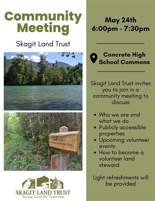Skagit Land Trust invites you to join in a community meeting to learn about what the land trust does and how to get involve with stewarding conservation lands in the Upper Skagit region. Volunteering with the land trust is an excellent way to connect with fellow community members while also giving back to the environment. We will have information on publicly accessible land trust properties, upcoming work parties, how to become a volunteer land steward and more. Trust events are typically open to all ages and experience levels, so please come to learn more about our work and how you can get involved. Light refreshments will be provided.