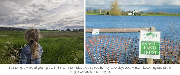 The waves of tall grass that fill Barney Lake during the summer can leave you wondering where the lake went. As a seasonal lake, Barney fills each fall, playing a vital role in absorbing flood waters from the Skagit and Nookachamps. As development expands towards the edges of Barney Lake, protection of this natural area has become even more important for the health of wildlife and people. The floods in November 2021 brought the waters of the Skagit River right to the edge of College Way. The Barney Lake Conservation Area was able to hold enormous amounts of flood waters, lessening neighborhood flooding.
