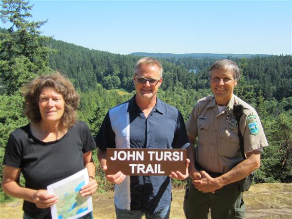 About the Hike: The trail is between the Anacortes Community Forest Lands and Deception Pass State Park. It traverses past meadows and rocky balds, a red rock quarry, a miner’s shack, the “rock” of artist Morris Graves’ lore, and views of Pass Lake, Campbell Lake, and Mount Erie. It starts (or ends) in the old growth forest at Pass Lake in Deception Pass State Park. SLT did the real estate and landowner outreach to get this trail in place that is now partially owned by the County and partially owned by the State Park. SLT holds conservation easements on the ACFL near the northern edge of the trail and has also helped to add another 80 acres just off the trail to Deception Pass State Park. The trail is 1.1-mile one way. It is accessible year-round and very lovely always. I especially like it in spring with wildflowers out. John Tursi was a dear friend of many of us and a great conservationist.