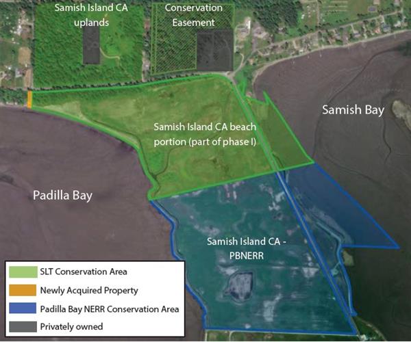 This summer Skagit Land Trust (the Trust) added 50 feet of shoreline on Padilla Bay to our Samish Island Conservation Area with help from a federal National Coastal Wetlands Conservation Grant as well as Trust reserve funds. This latest addition continues a decades-long effort to conserve the forested uplands and approach via an isthmus to Samish Island.