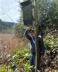 | | Jim Owens, who owns working forestlands south of Mount Vernon, is getting ready for spring. “The wood ducks are coming back and I’ve got some new nest boxes to install for them.” The nest boxes are part of an ongoing cycle of caring for the forest he has owned and managed for the past 25 years. Also on the task list is checking the wildlife cameras that he has stationed throughout his 40-acre property. “Someone said they saw cougars the other day,” Jim shares with excitement in his voice. “It’s about time for a bear to show up. That’s what I look for in the spring. Wood ducks and bear tracks.” |