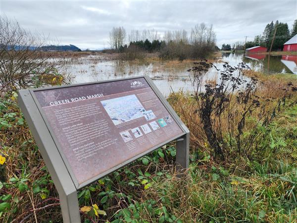 The Trust’s Green Road Marsh Conservation Area (pictured below) plays a similar role, soaking up floodwaters from the Samish River and reducing flood risk while supporting healthy habitat.